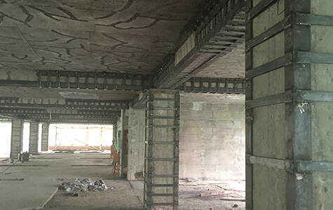 By the method of sticking steel plate for reinforced concrete columns: improving the compressive strength of concrete, and solving the bending moment and insufficient shearing resistance of columns.